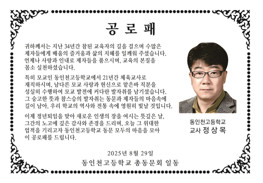 동문 발전에 이바지 한 정상목 동문님 노고에 감사드립니다.